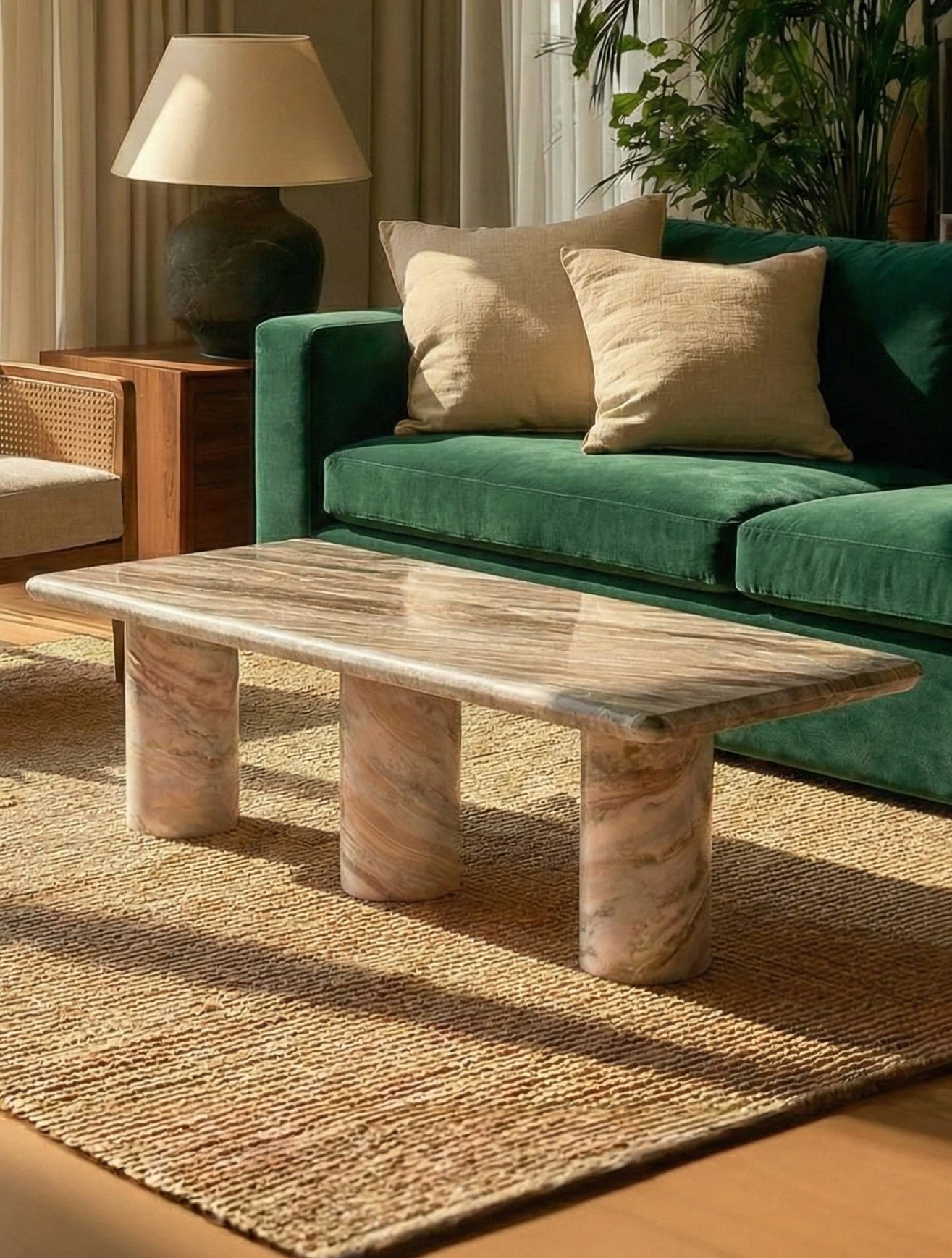 The coffee table’s smooth marble surface rests gracefully atop sturdy cylindrical marble pillars, creating a sculptural and luxurious focal point for any room.