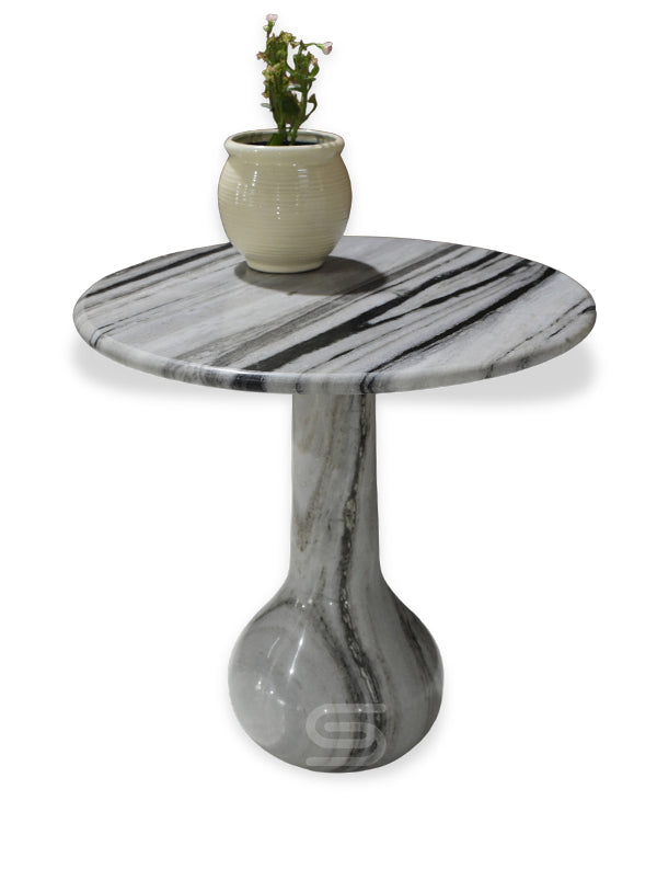 A striking silhouette with a fluid stem and orb detail, finished with a round marble top. Elegant and sculptural, it doubles as functional art.