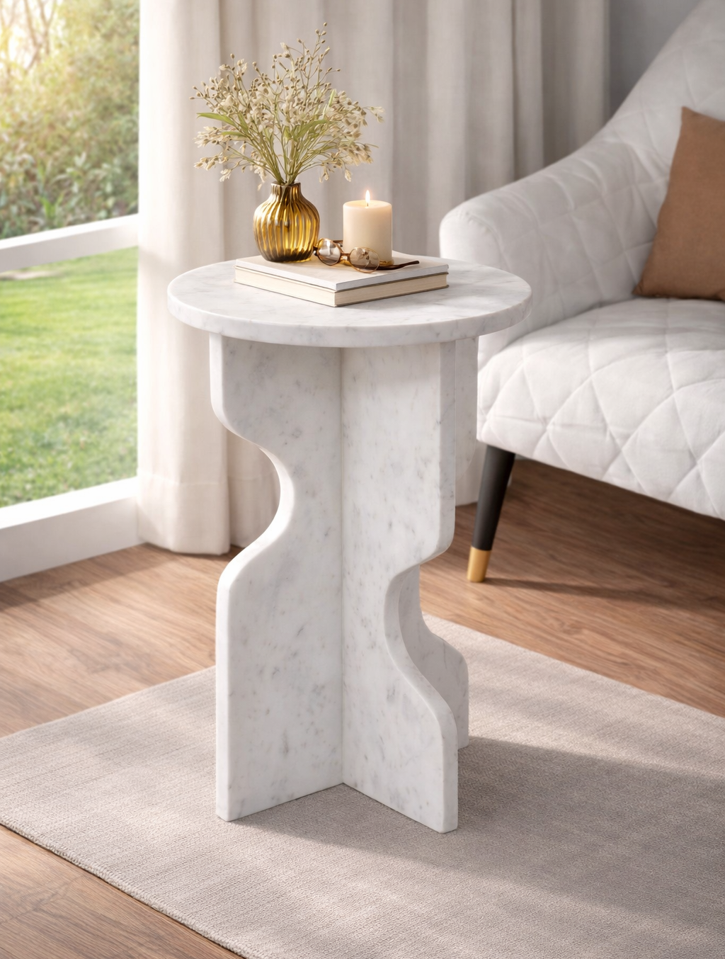 The Crest Side Table features a smooth stone surface with soft curves and subtle natural detailing. Crafted from solid stone with a fluid sculptural silhouette, it adds a refined and modern accent to contemporary living spaces.