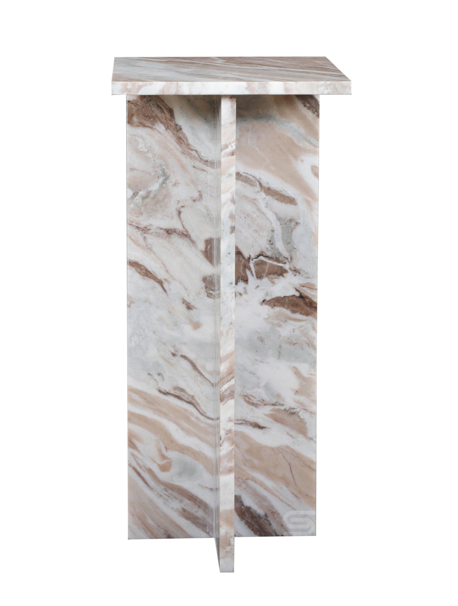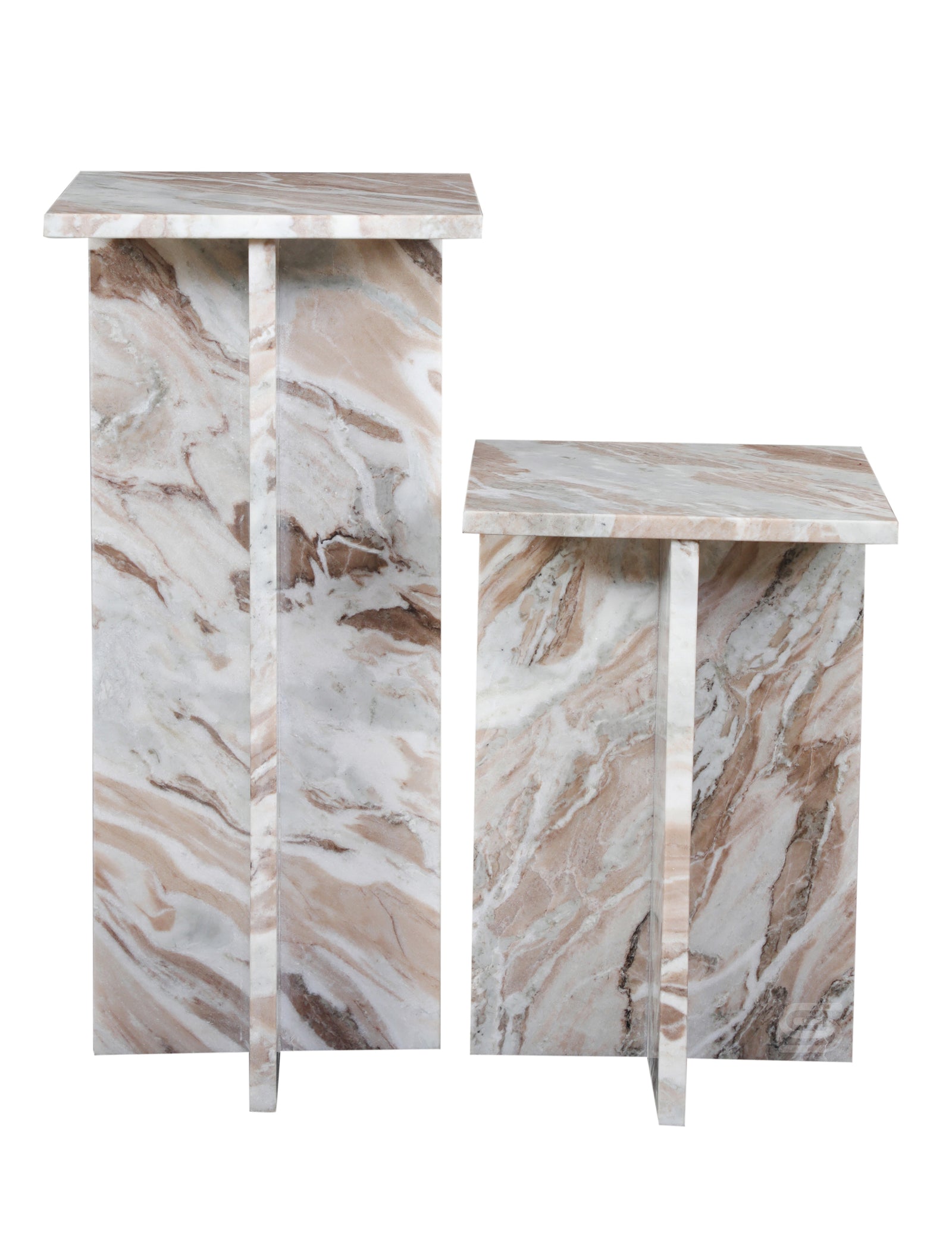 The Marble-Flow Side Table Set features soft flowing stone patterns with warm natural veining. Crafted from solid stone in two complementary heights, these sculptural tables add layered elegance and versatility to modern living spaces.